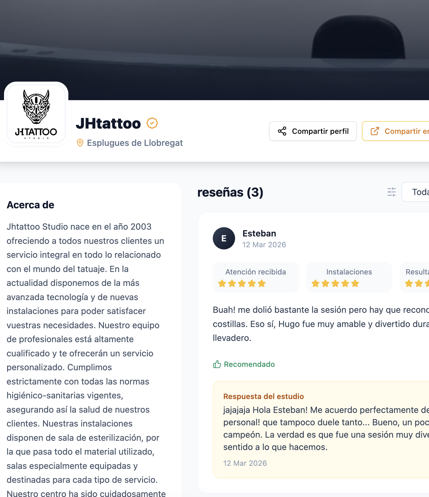 Google Reviews está bien. Es gratuito, todo el mundo lo conoce y ayuda a que te encuentren. Pero Google no sabe nada de tatuajes. Le da igual si eres un maestro del realismo o llevas tres meses abriendo estudios en el salón de tu casa. Para Google, eres un negocio más entre millones.